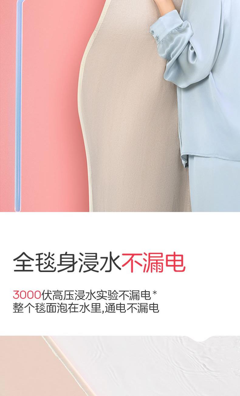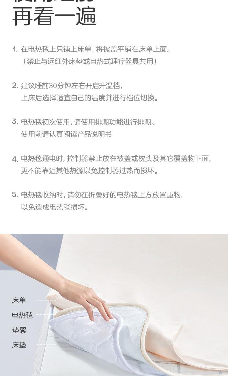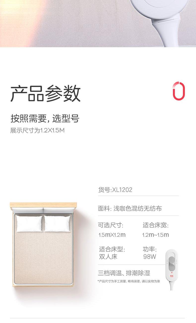 参数 : 型号:TT150×120-4XB 功率:98W 功能:三档调控,排潮除湿 面料:化纤 包装:无纺布袋 特点: 1、全线路安全保护调温电热毯,遇水遇尿不漏电 2、采用双层螺旋发热线和特别安全保护控制器,实现高温断电保护 3、低能耗,每晚不到一度电