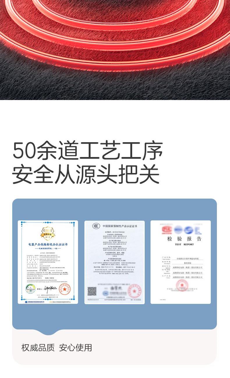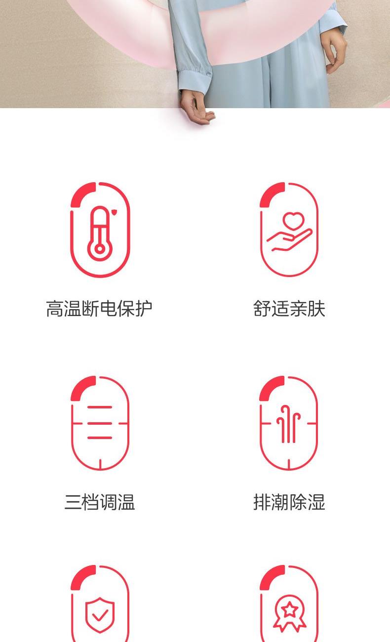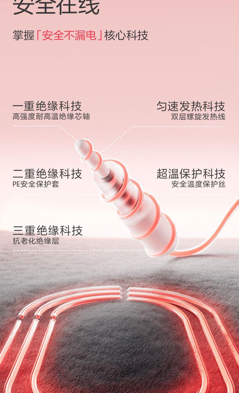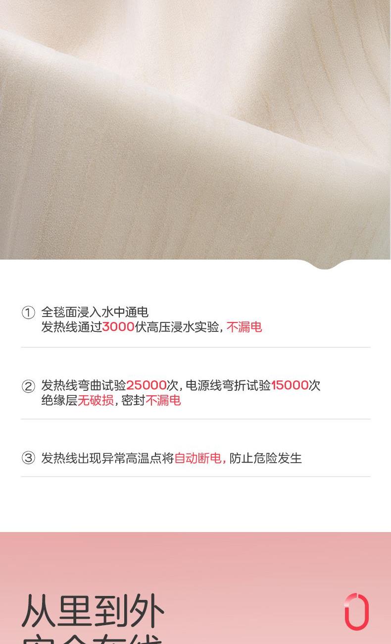 参数 : 型号:TT150×120-4XB 功率:98W 功能:三档调控,排潮除湿 面料:化纤 包装:无纺布袋 特点: 1、全线路安全保护调温电热毯,遇水遇尿不漏电 2、采用双层螺旋发热线和特别安全保护控制器,实现高温断电保护 3、低能耗,每晚不到一度电